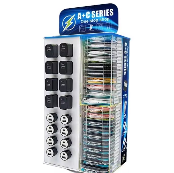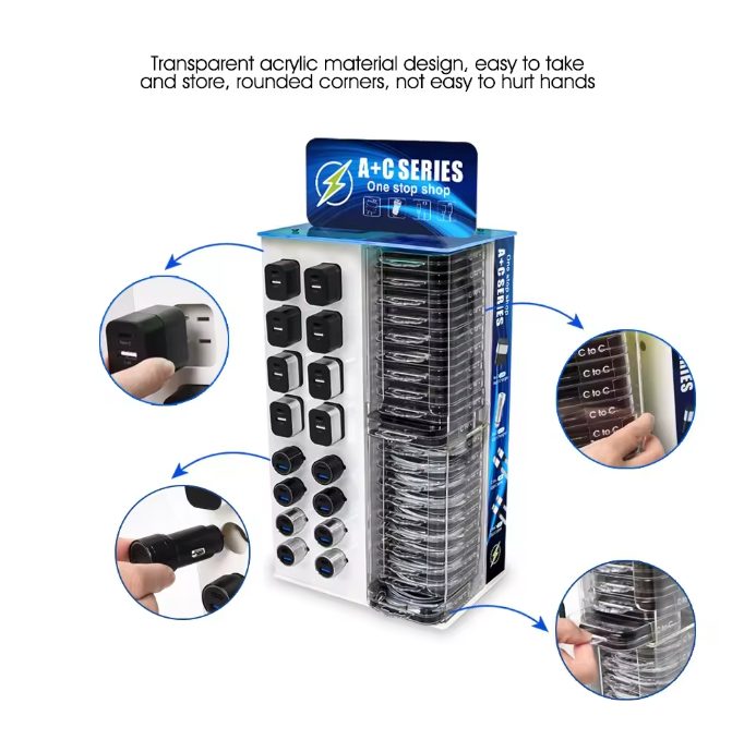 This Mobile Phone Accessory Display with USB A to USB C car and wall chargers, coupled with PD fast charging cables, is an ideal choice for retailers looking to enhance their product offerings and customer experience. It combines functionality, convenience, and visual appeal to drive sales and meet the demands of today’s mobile-centric consumers.